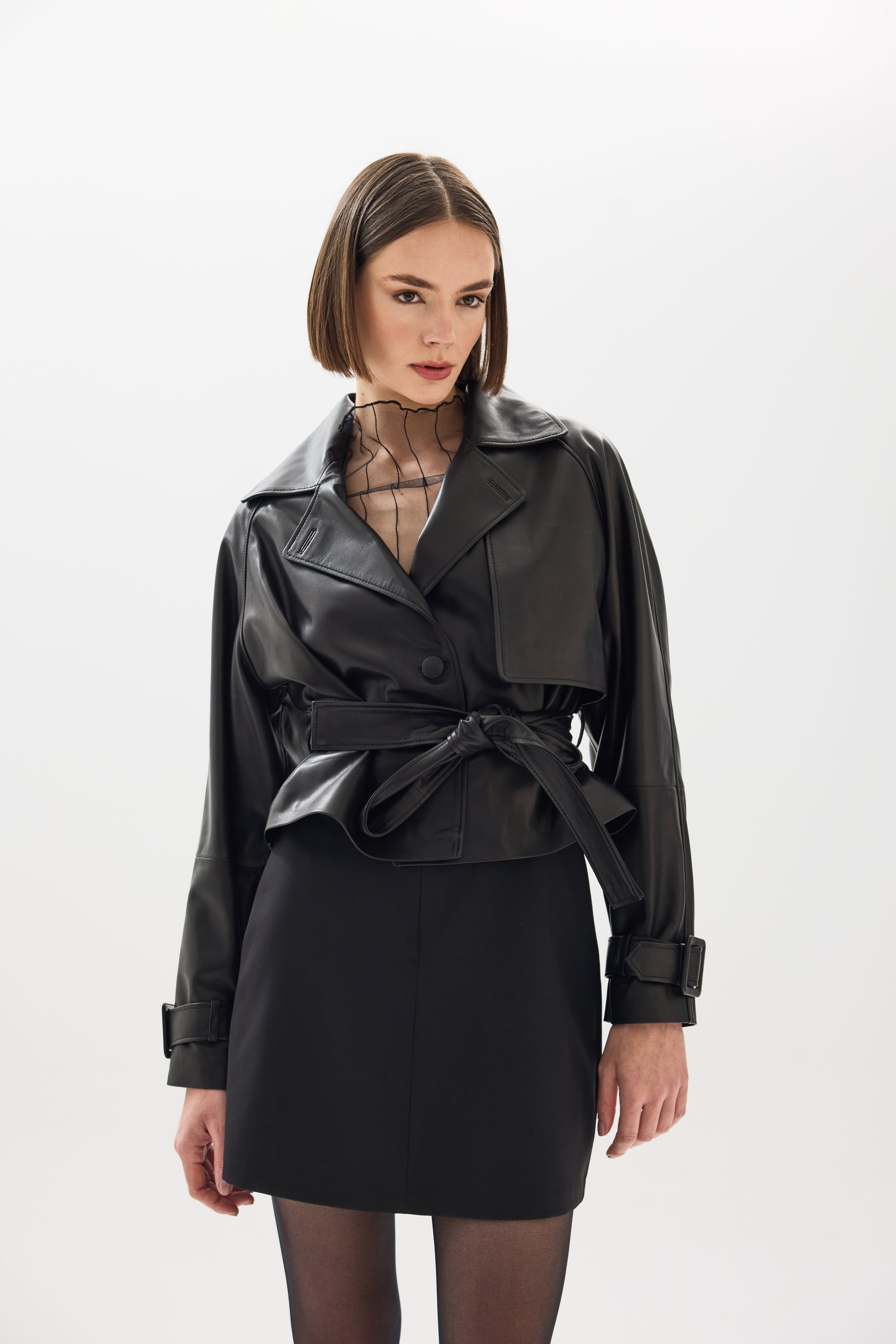 Meticulously handcrafted from fine, soft uzu leather, the Monaco Jacket stands out with its wide lapels, bold waist belt, and oversized style, emphasizing a powerful stance. It combines understated elegance with timeless elegance, from day to night.