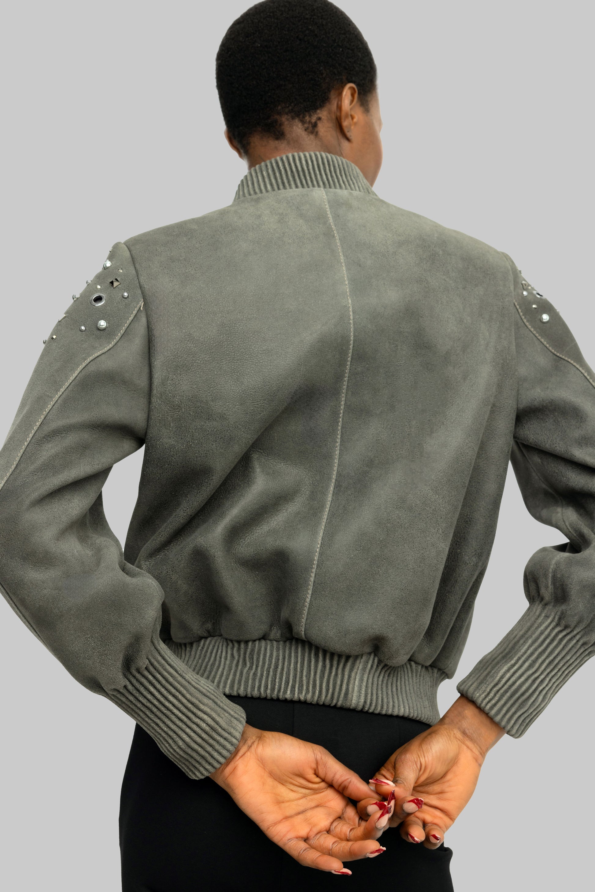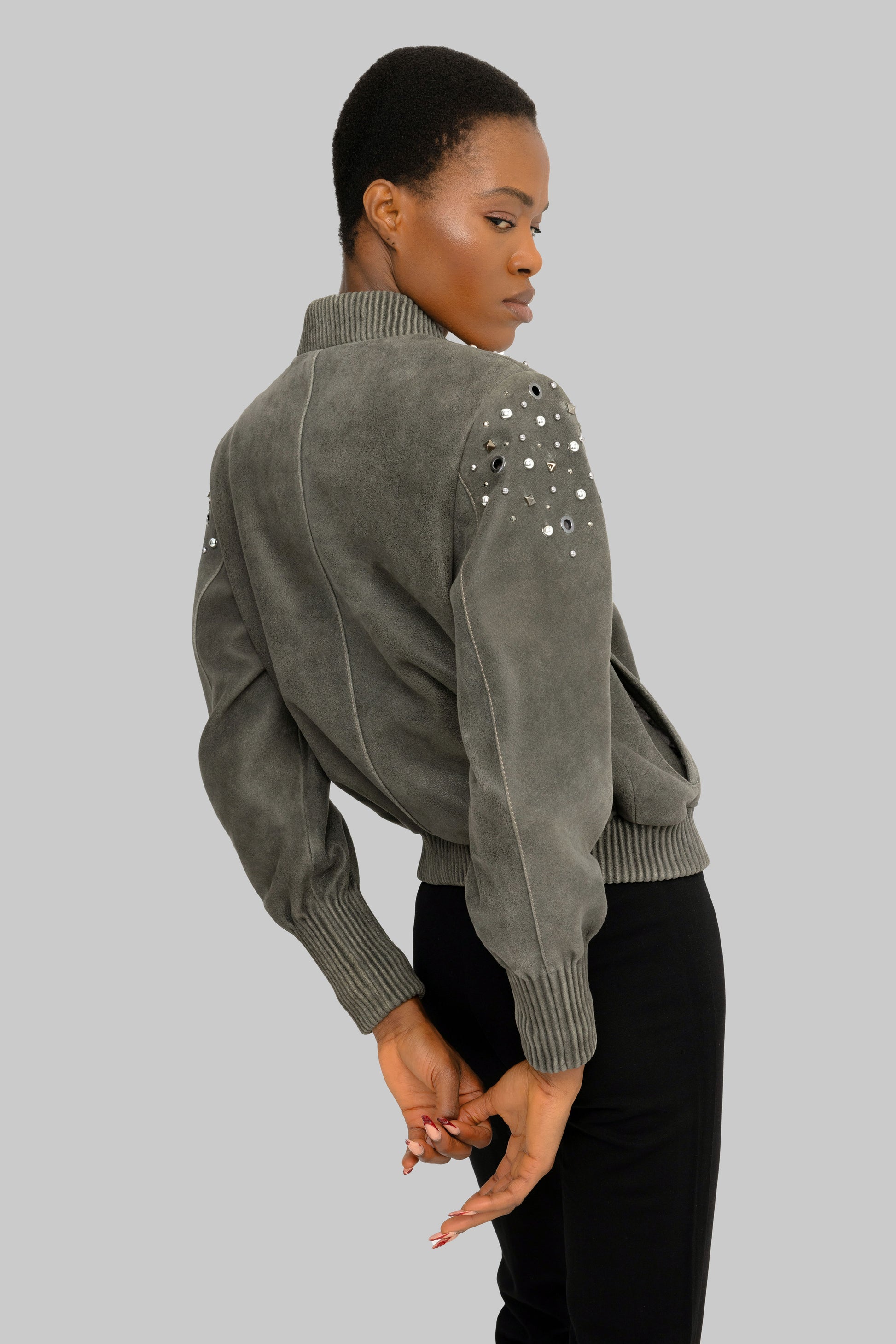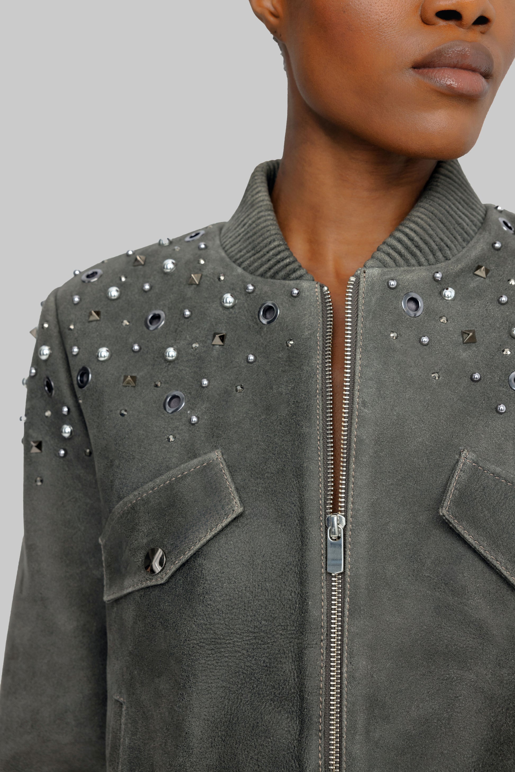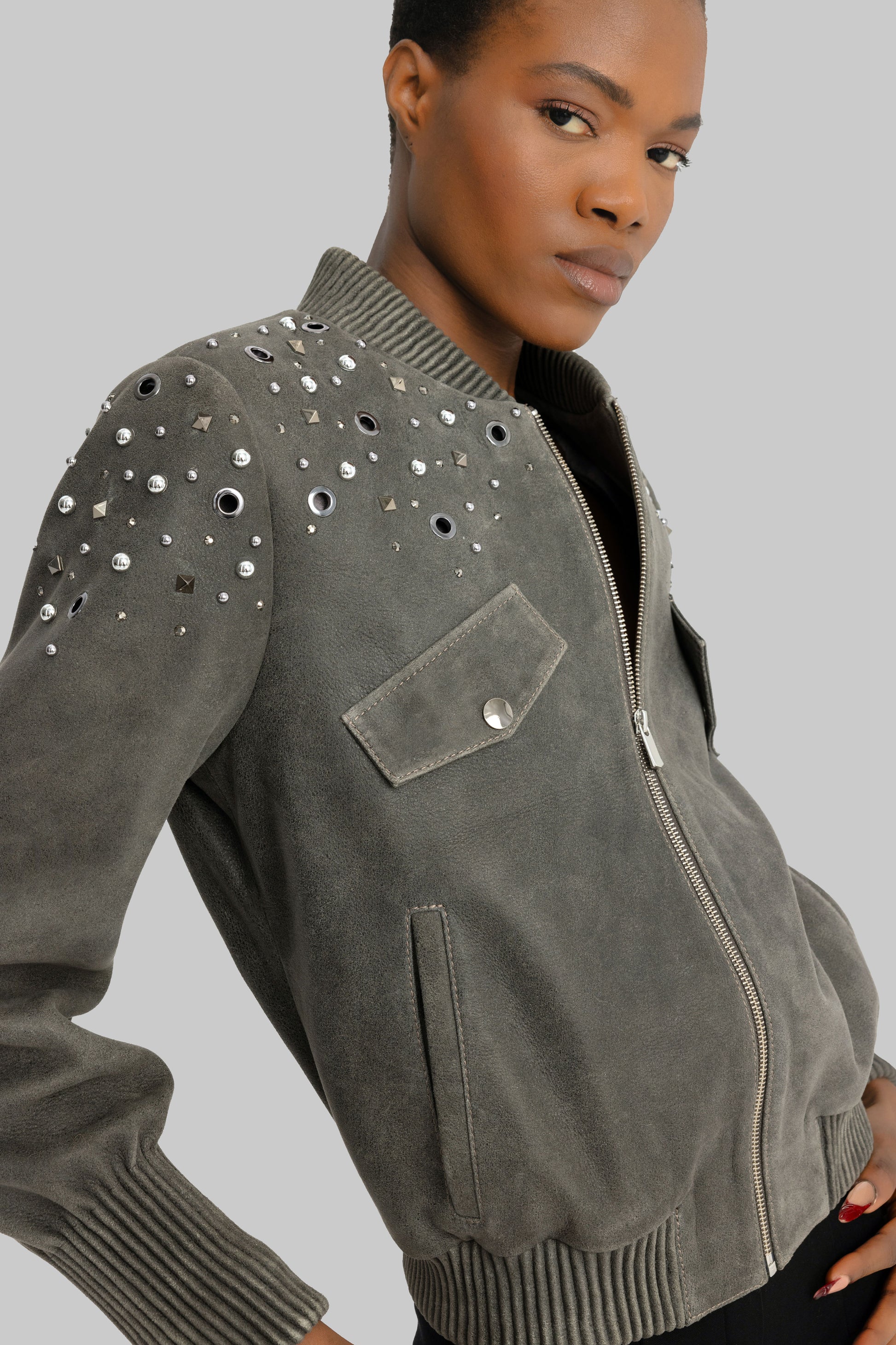 The Dubai Gray Bomber Jacket is handcrafted from Nuplin lambskin and features studs, stones, and eyelets on the shoulders and sleeves. A ribbed collar, cuffs, and hem complete the jacket's bold look. It features two chest pockets and a front zipper. For a more oversized look, order one size larger.