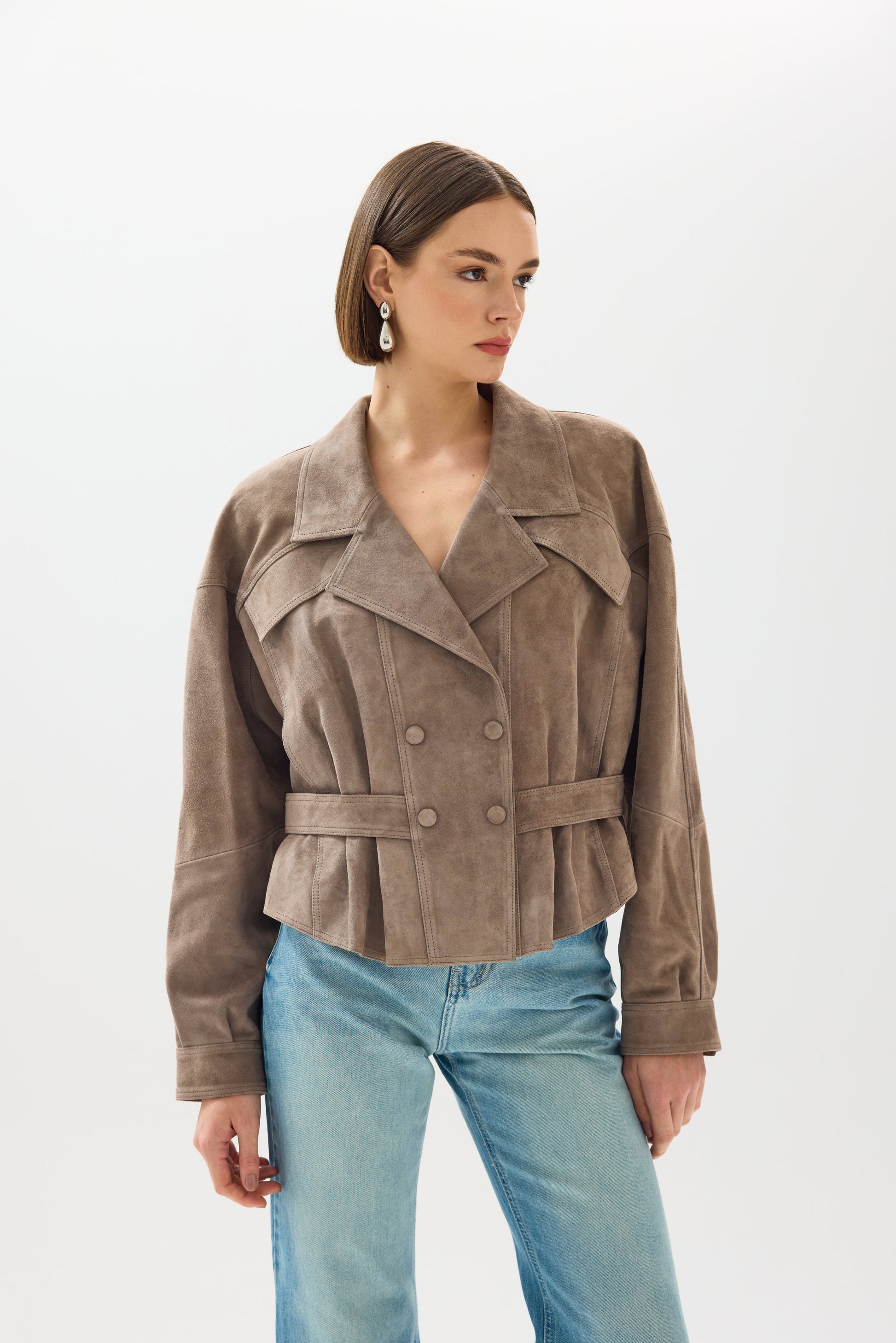 Süet deriden el işçiliğiyle üretilmiştir. Bu ceket, klasik terziliği modern bir bakış açısıyla yeniden yorumlar. Hafif bol kesimi, belden oturtmalı yapı ve panel detaylarıyla dengelenmiştir. Geniş yakalar ve çift sıra düğmeler vintage ve zamansız bir dokunuş sunar. Arka kısımdaki yan ayarlayıcılar, fit görünüm üzerinde ince ayarlar yapılmasına olanak tanır.