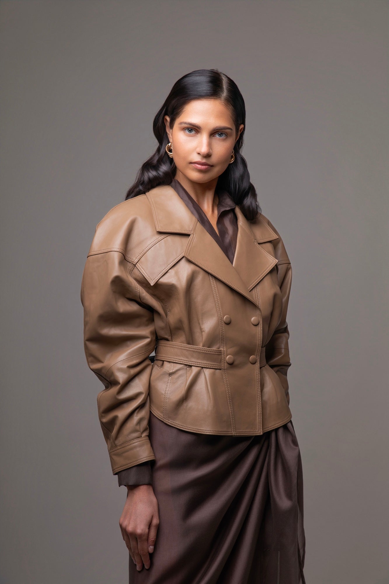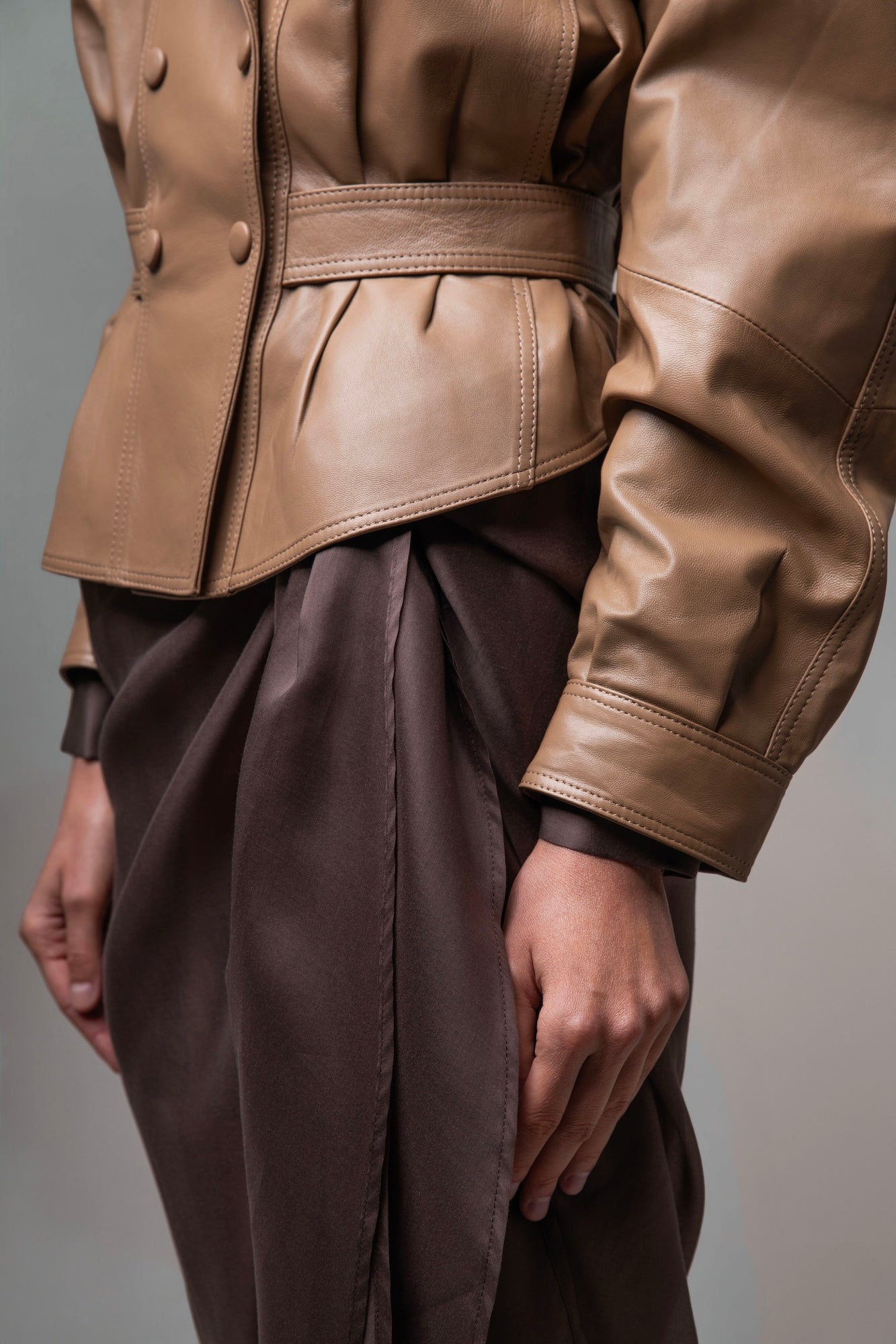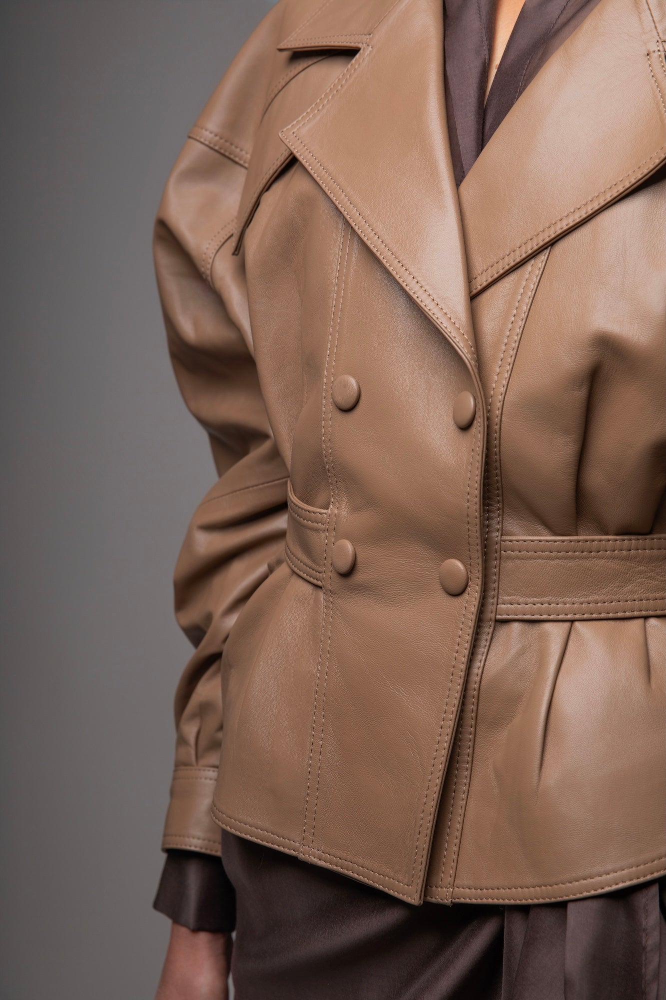 Kuzu derisinden el işçiliğiyle üretilmiştir. Bu ceket, klasik terziliği modern bir bakış açısıyla yeniden yorumlar. Hafif bol kesimi, belden oturtmalı yapı ve panel detaylarıyla dengelenmiştir. Geniş yakalar ve çift sıra düğmeler vintage ve zamansız bir dokunuş sunar. Arka kısımdaki yan ayarlayıcılar, fit görünüm üzerinde ince ayarlar yapılmasına olanak tanır.