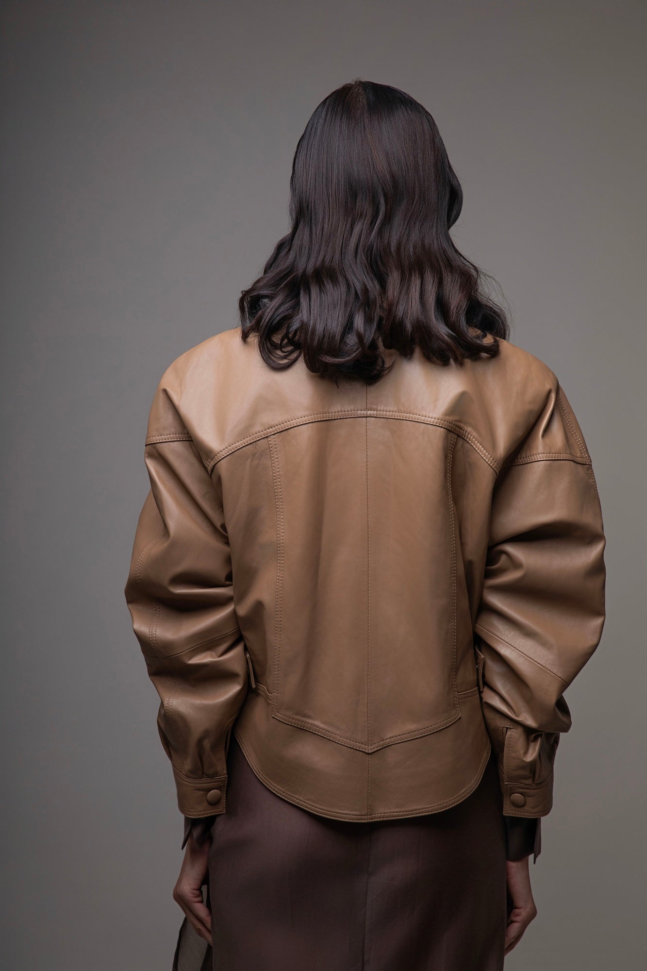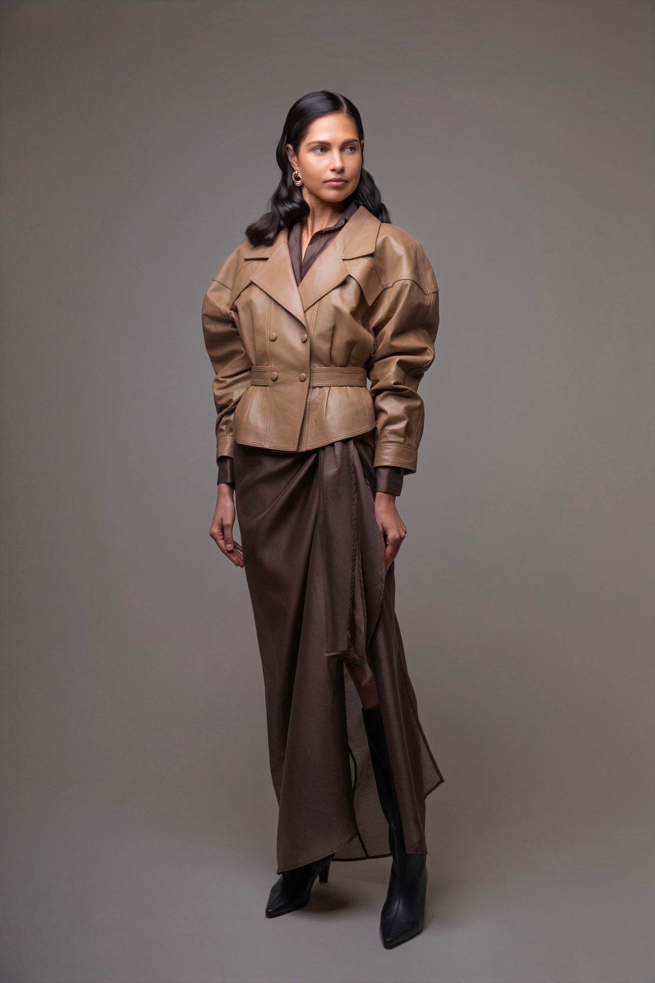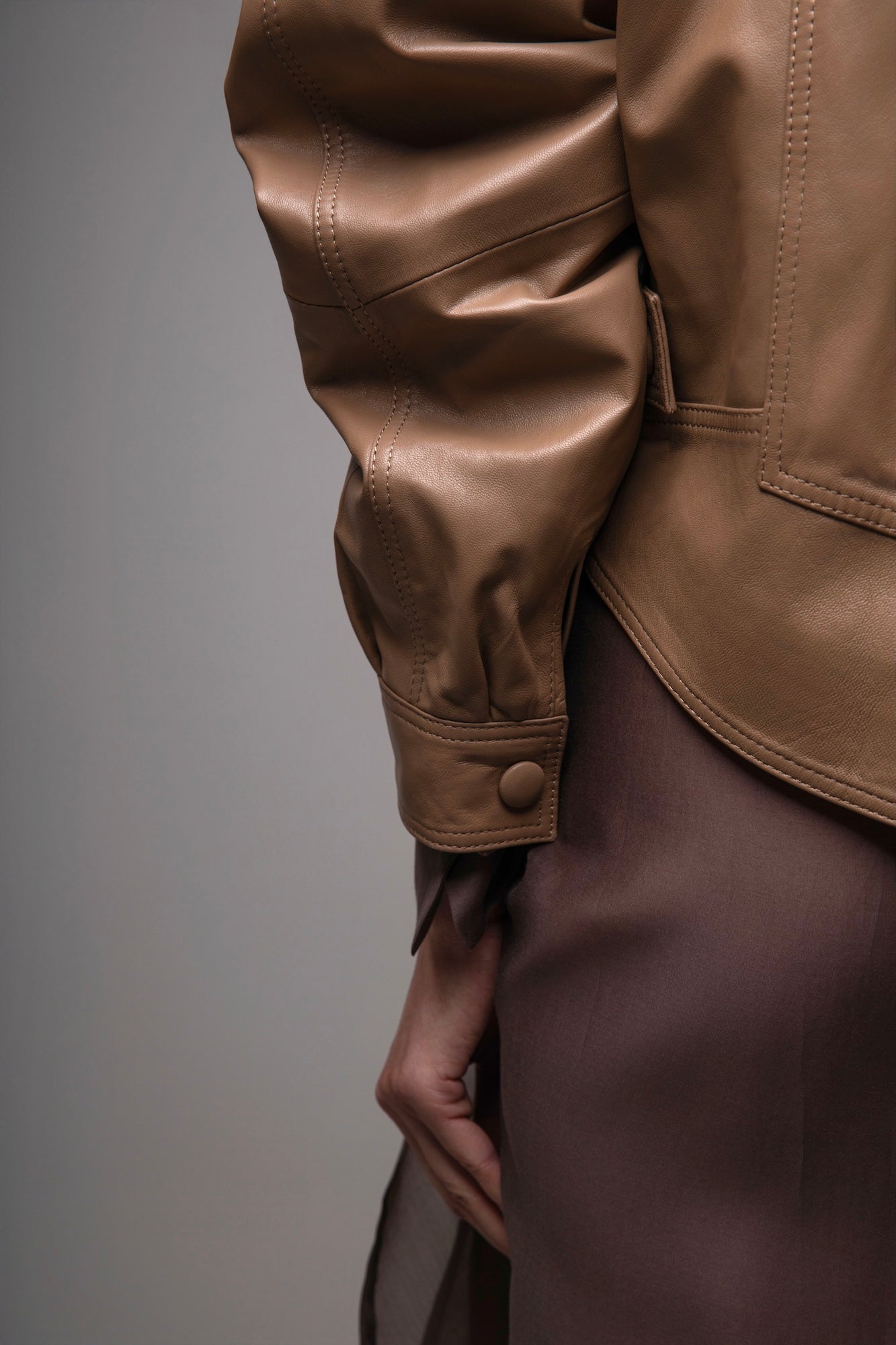 Kuzu derisinden el işçiliğiyle üretilmiştir. Bu ceket, klasik terziliği modern bir bakış açısıyla yeniden yorumlar. Hafif bol kesimi, belden oturtmalı yapı ve panel detaylarıyla dengelenmiştir. Geniş yakalar ve çift sıra düğmeler vintage ve zamansız bir dokunuş sunar. Arka kısımdaki yan ayarlayıcılar, fit görünüm üzerinde ince ayarlar yapılmasına olanak tanır.