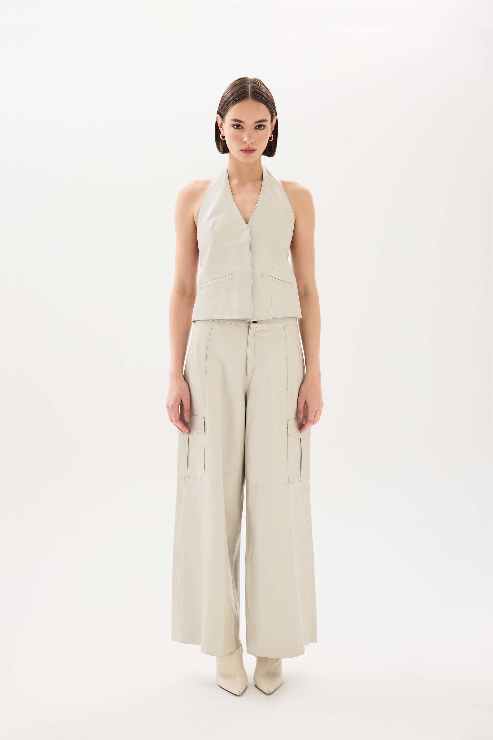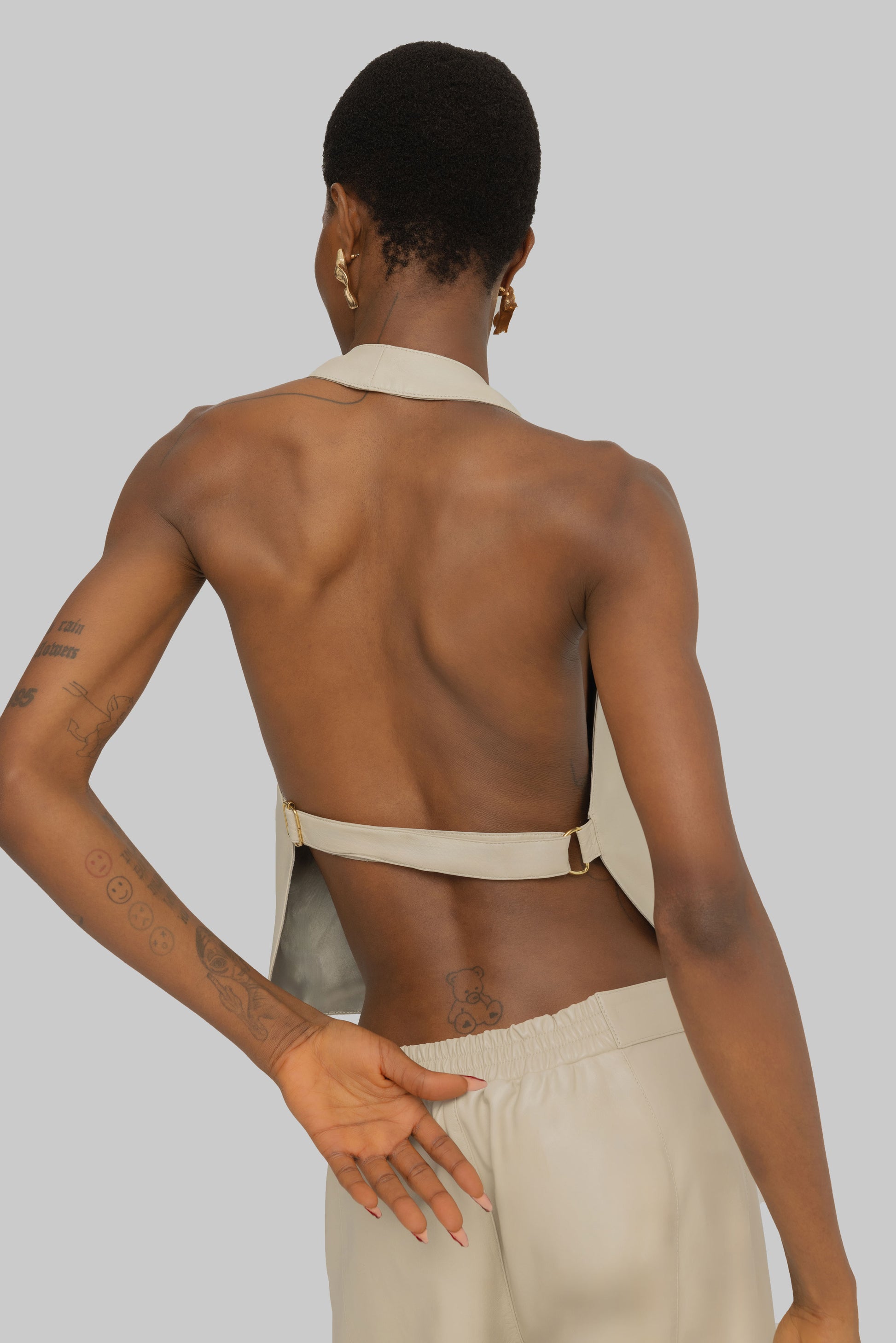 Marbella Top, modern zarafeti ve cesur minimalizmi bir araya getiriyor. Şık bir halter yakaya, vücuda oturan bir kesime ve ayarlanabilir askılar ve altın tokalarla tasarlanmış açık sırt detayına sahiptir. Marbella Pantolonla kombinlenerek mükemmel bir görünüm elde edilebilir.