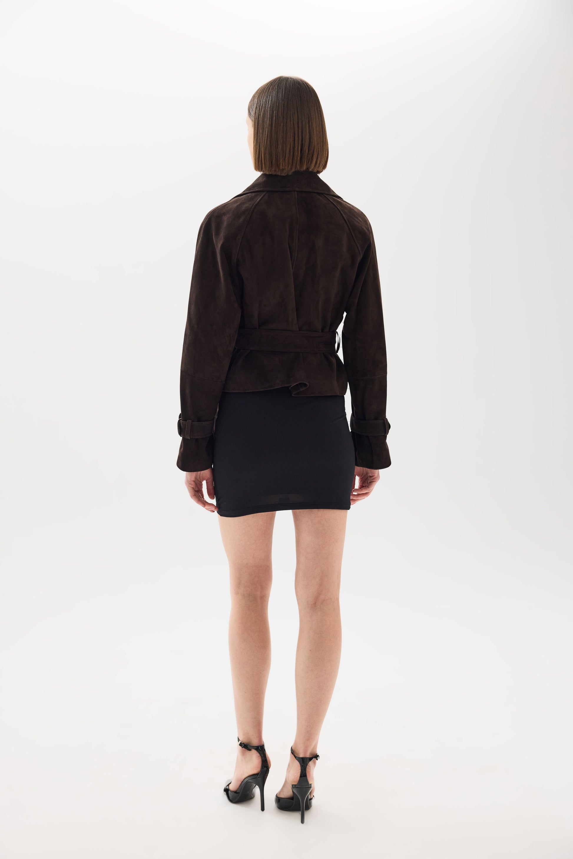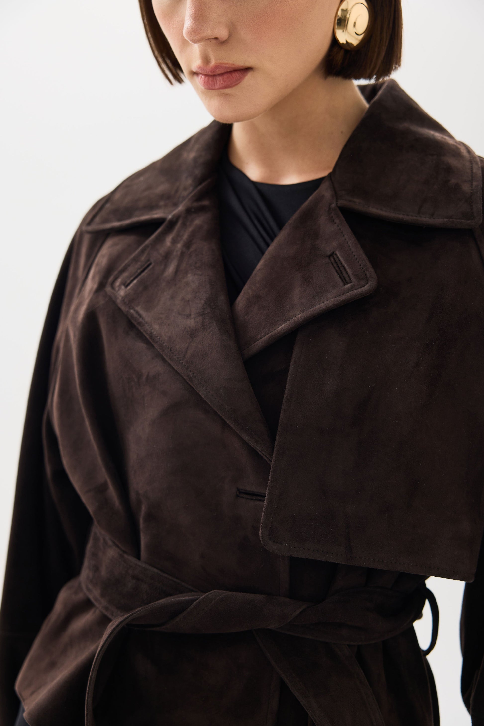 Monaco Ceket, süet keçi derisi ile üretilmiş; güçlü duruşu vurgulayan geniş yakaları, beli saran iddialı kemeri ve oversize tarzıyla dikkat çeker. Gündüzden geceye, sade bir şıklığı ve zamansız elegan duruşu bir araya getirir.