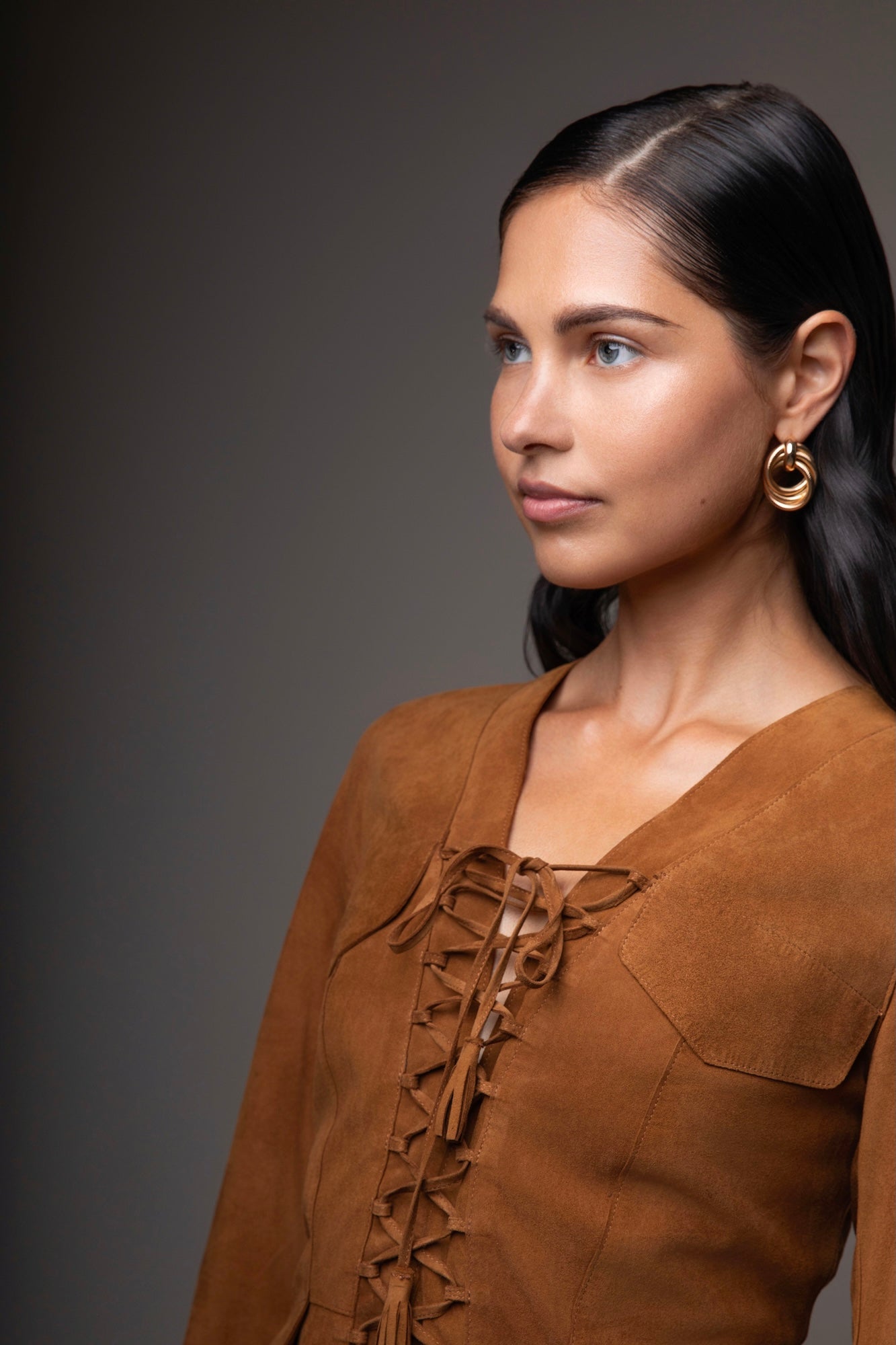 Nice Süet Elbise, uzun kollu tasarımı, önde bağcık detayları ve dört dekoratif kapaklı cebiyle dikkat çeker. İnce ve hafif keçi süeti derisinden el işçiliğiyle üretilmiş olup, doğal terzilik dikişlerine sahiptir. Western ilhamlı bir görünüm için favori botlarınızla kombinleyebilir veya akşam dışarı çıkarken topuklu ayakkabılarla şıklığınızı yükseltebilirsiniz.