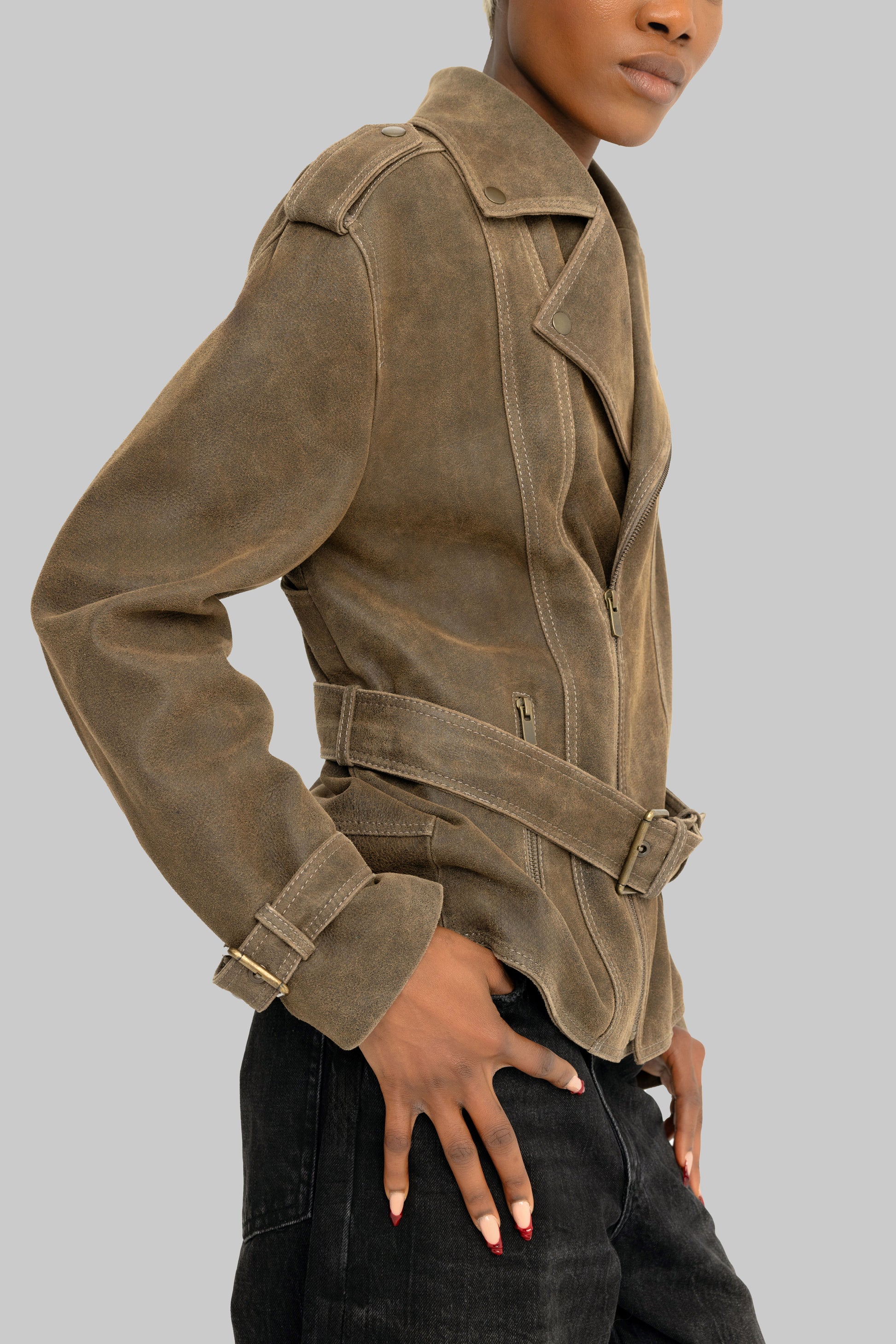 Paris Ceket, oversize kesimli, biker tarzda bir cekettir. Yanlarda fermuarlı cepler, bel ve kollarda kemer detayları bulunur. Nuplin kuzu derisinden el işçiliğiyle üretilen bu ceket, tarzınızı özelleştirmenize olanak tanıyan çıkarılabilir bir Tibet kürkü yakaya sahiptir.