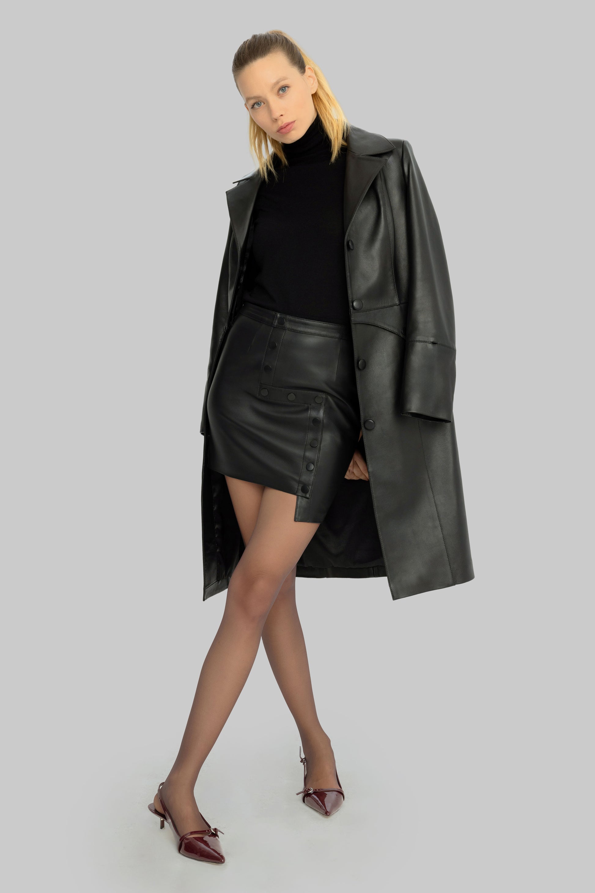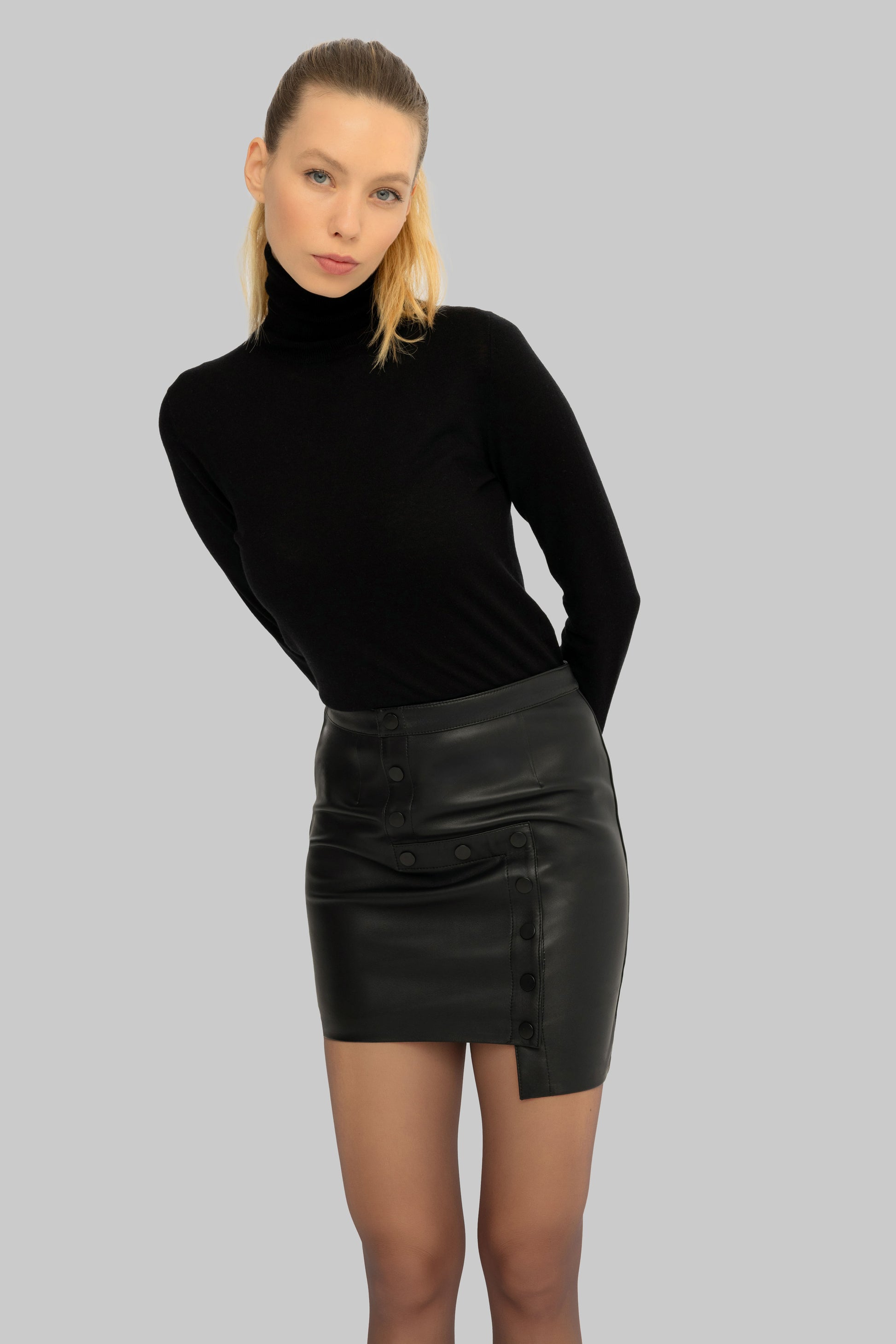 Seoul Black Skirt, cesur ve zarif bir gardırop parçasıdır. Mat, kalın kuzu derisinden el işçiliğiyle üretilmiş olan bu parça, benzersiz bir asimetrik tasarıma ve dikkat çekici çıtçıt detaylarına sahiptir.