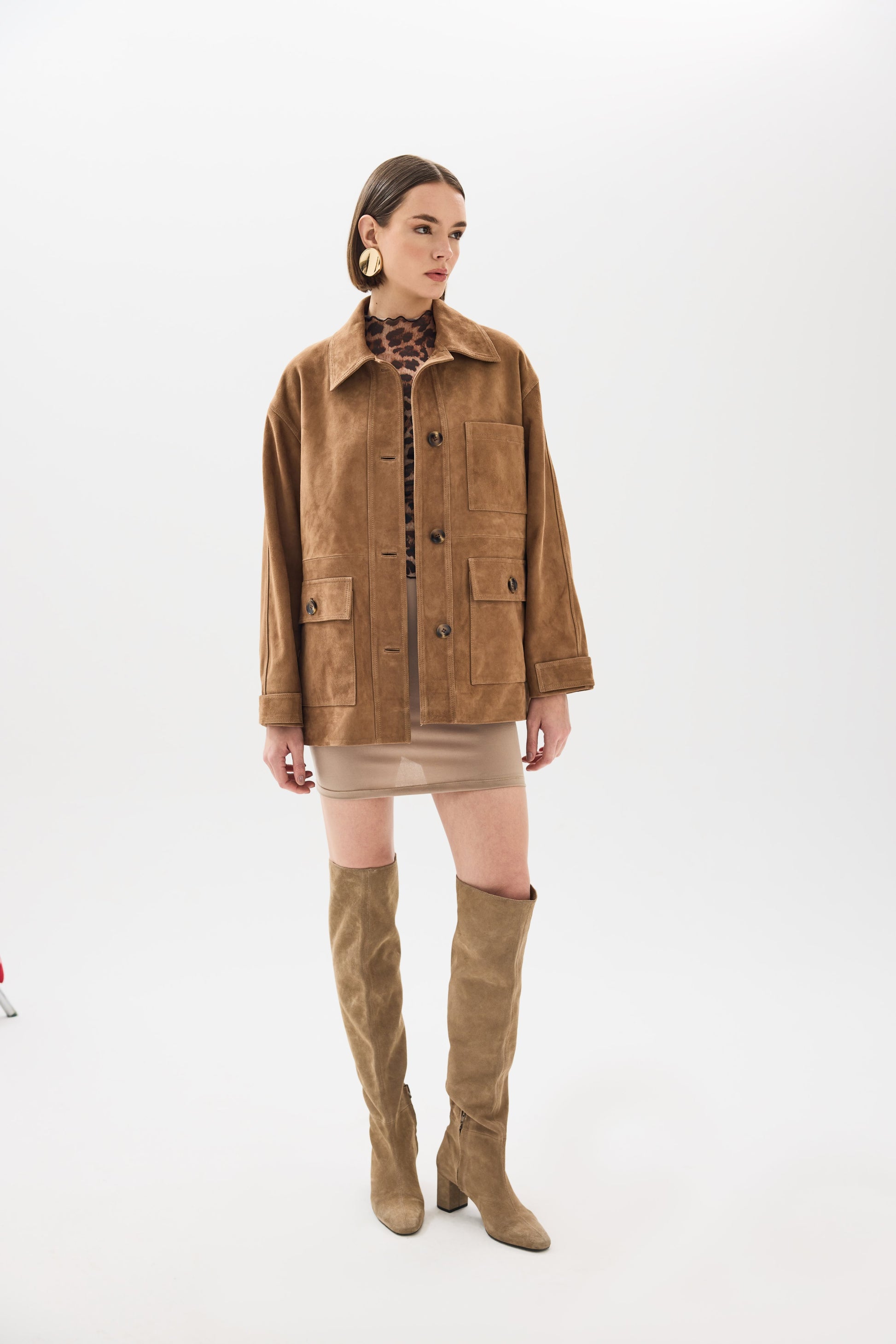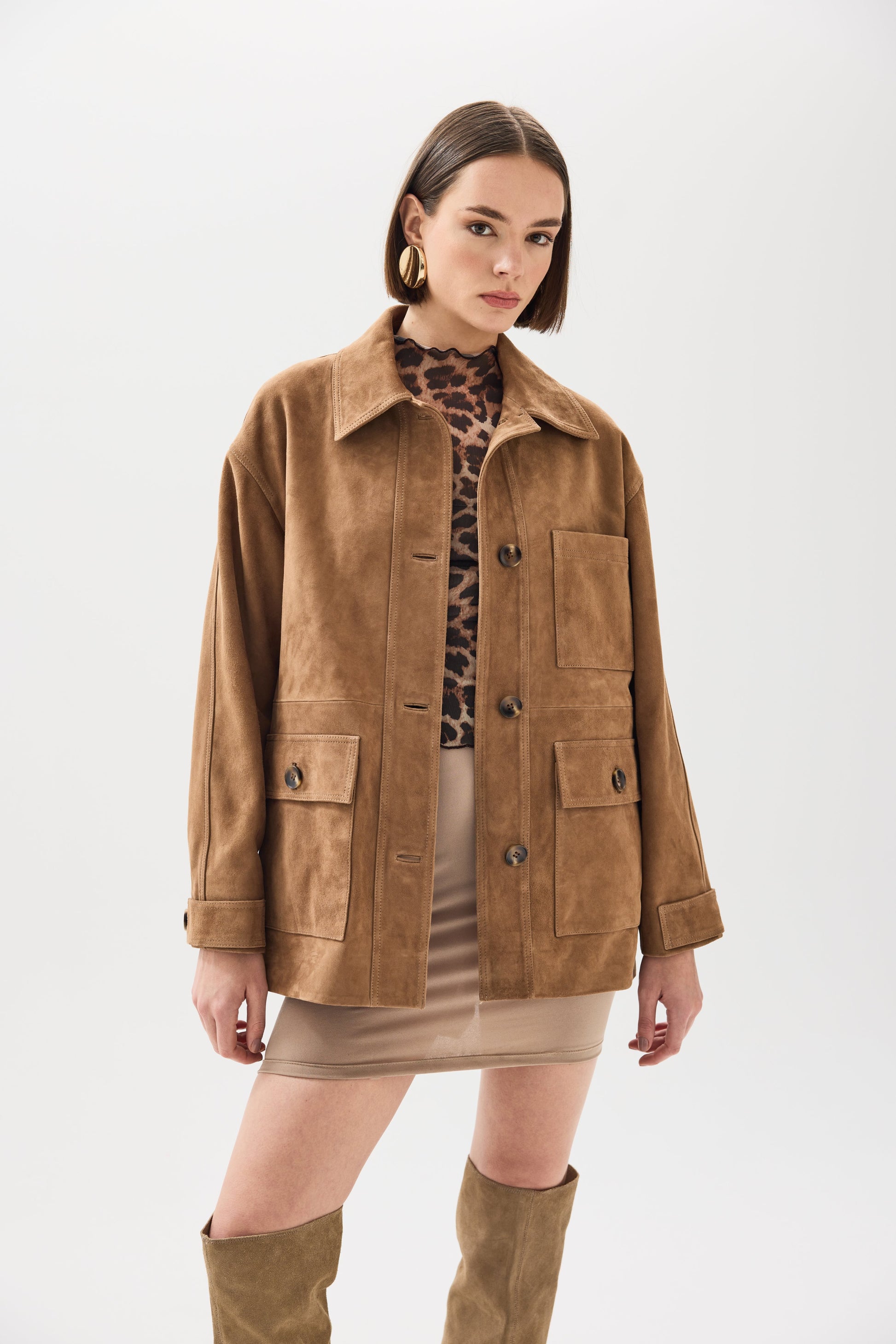 Klasik barn ceketin modern bir yorumu: Orta kalınlıkta, birinci sınıf süet deriyle, karamel tonunda el işçiliğiyle üretilmiştir. Düz kesim ve rahat kalıba sahip bu model, büyük cep detayları, manşet kayışları ve keskin yakasıyla dikkat çeker.