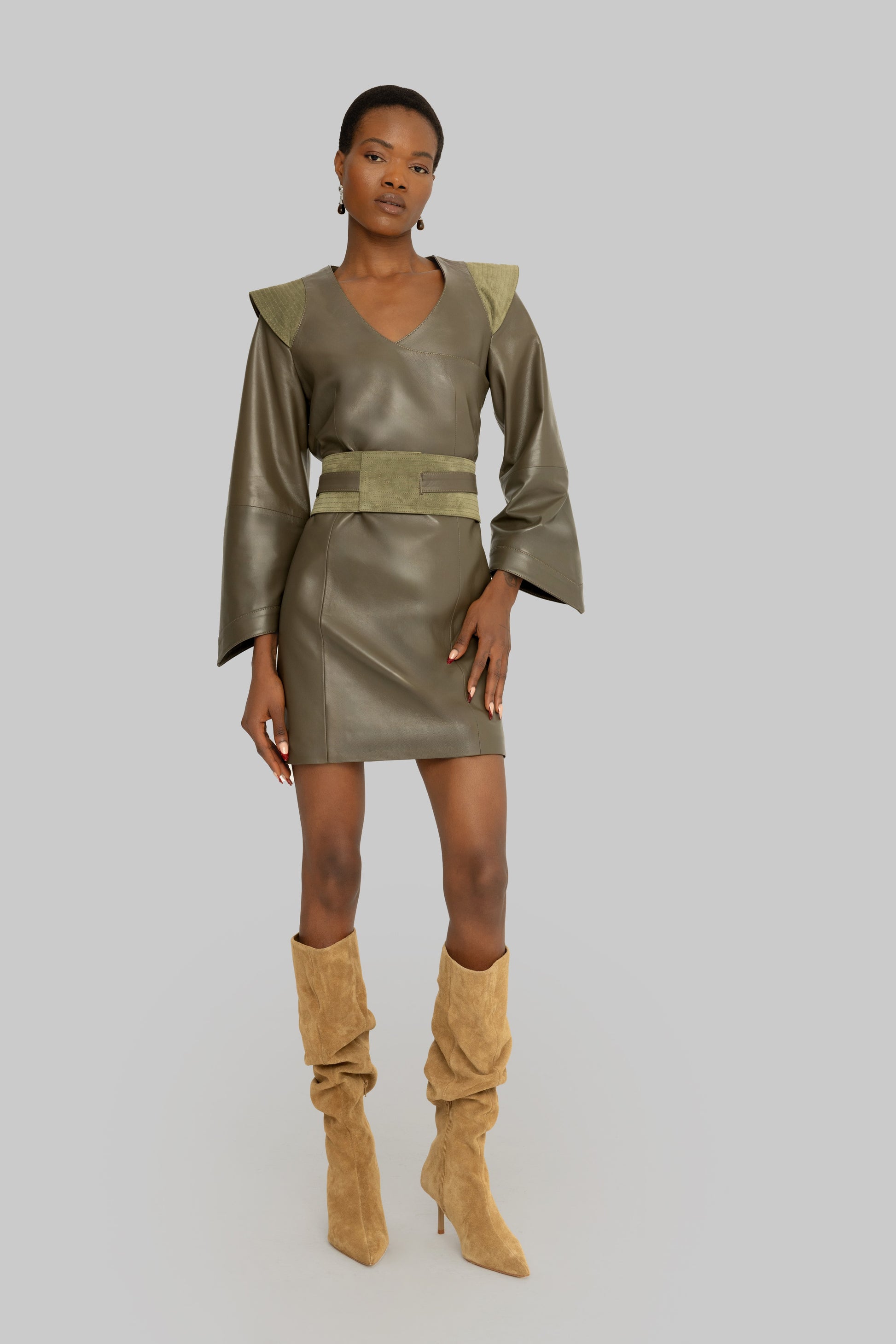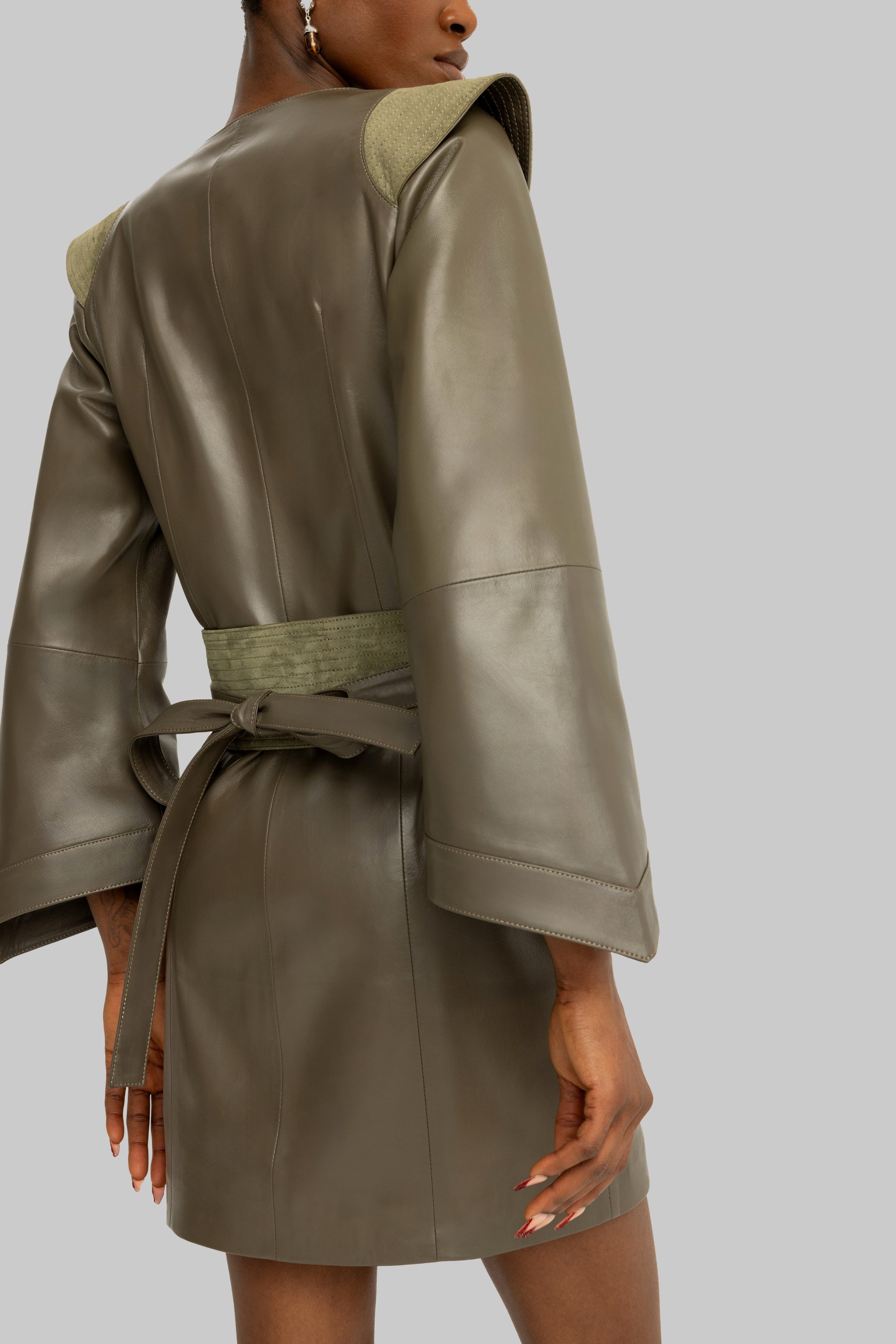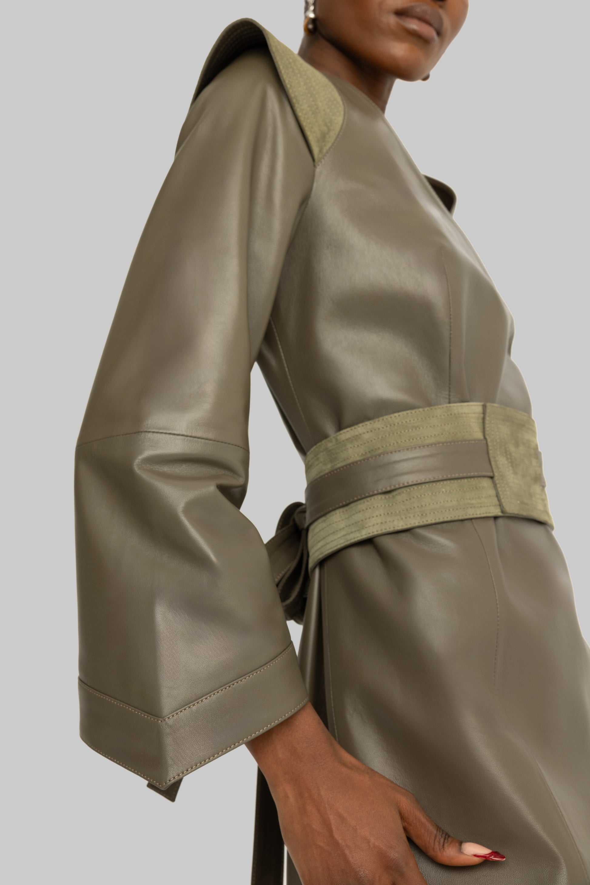 Tokyo Elbise, haki kuzu derisinden el işçiliğiyle üretilmiş kimono tarzı tasarımıyla dikkat çeker. Omuzlarda ve kemerde süet detaylarıyla benzersiz bir dokunuş sunar. Sarma yaka ve yan fermuarı ile şıklığını tamamlar.