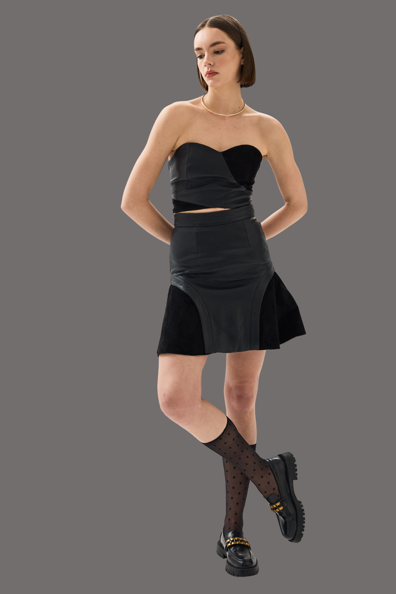 El işçiliğiyle üretilmiş jumbo deri ve süet deri kombinasyonu ile Vegas Etek, yüksek bel kalça hattını sararken, etek ucundaki genişleyen süet paneller silueti beklenmedik bir akıcılıkla yumuşatır. Güçlü, eğlenceli ve tek başına ya da Vegas Top ile kombinlendiğinde etkileyici bir görünüm sunar.